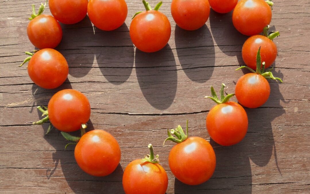 Small decorative tomatoes – composed in the form of heart. Ecological symbol of love. A szeretet ökológiai szimbóluma.